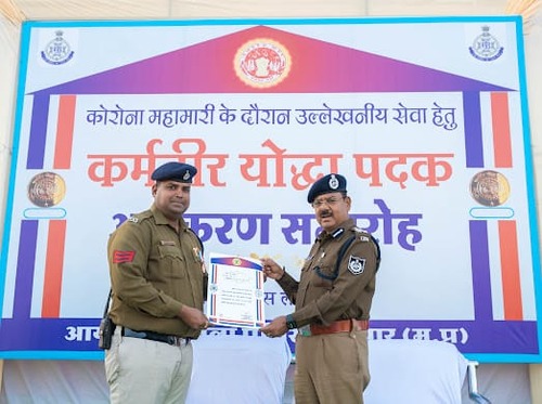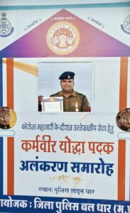 जिला मुख्यालय धार की डीआरपी लाइन आयोजित एक समारोह में नालछा थाने पर पदस्थ हेड कांस्टेबल धर्मेश राजू रायकवार को कर्मवीर योद्धा पदक से सम्मानित किया गया है यह सम्मान उन्हें कोरोना काल में मेहनत और लगन से काम करने के लिए दिया गया है।