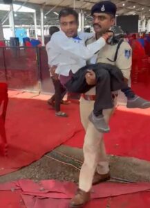 आपको बताते हैं कि पूरा मामला क्या है दरअसल 17 सितंबर को धार जिले के बदनावर तहसील के भैंसोला में पीएम मित्रा मेगा पार्क का भूमि पूजन करने प्रधानमंत्री नरेन्द्र मोदी आए थे इस कार्यक्रम में धामनोद टीआई प्रवीण ठाकरे विशाल जनसभा के दौरान वीवीआईपी ड्यूटी में तैनात थे सभा स्थल पर भारी भीड के बीच एक दिव्यांग व्यक्ति जो हाथों के सहारे जमीन पर सरकते हुए पांडाल में प्रवेश करने की कोशिश कर रहे थे उन्हें देख टीआई प्रवीण ठाकरे तुरंत उनके पास पहुंचे उनसे बात की तो पता चला कि सुरक्षा कारणों से व्हीलचेयर की सुविधा उपलब्ध नहीं हो पा रही है तो टीआई ठाकरे ने बिना देर किए दिव्यांग व्यक्ति को अपनी गोद में उठाकर उनकी गाड़ी तक पहुँचा कर उनकी सहायता कर मानवीय संवेदनाओं की मिसाल पेश की जिसकी तस्वीरे वहाँ मौजूद मीडिया कर्मियों ने खिंच ली जो अब राष्ट्रीय स्तर तक चर्चा बटोर रही है।